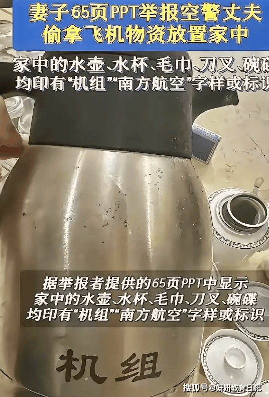 在任职期间一直偷拿公司的东西,女方用词很大,把这件事情描述成偷拿飞机物资数年,并且还晒出了林林总总的照片,比如什么价值1000多块的水壶。